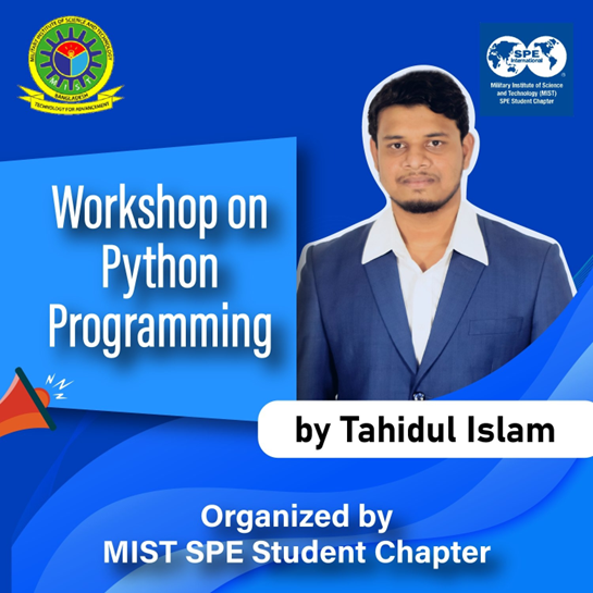 A workshop on Python programming was organized by the MIST SPE Student Chapter in 2023. This workshop aims to introduce the basic structure of Python programming for machine learning in the field of petroleum and mining engineering. This workshop was held for 3 days. In this workshop, students gathered the basic knowledge of the Python programming language and it's application in the petroleum industry. A total of 60 students participated through online platforms, and those who successfully completed the workshop were awarded with certificates.